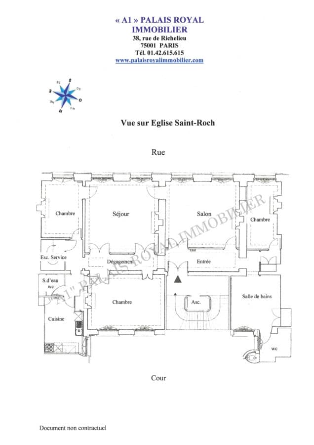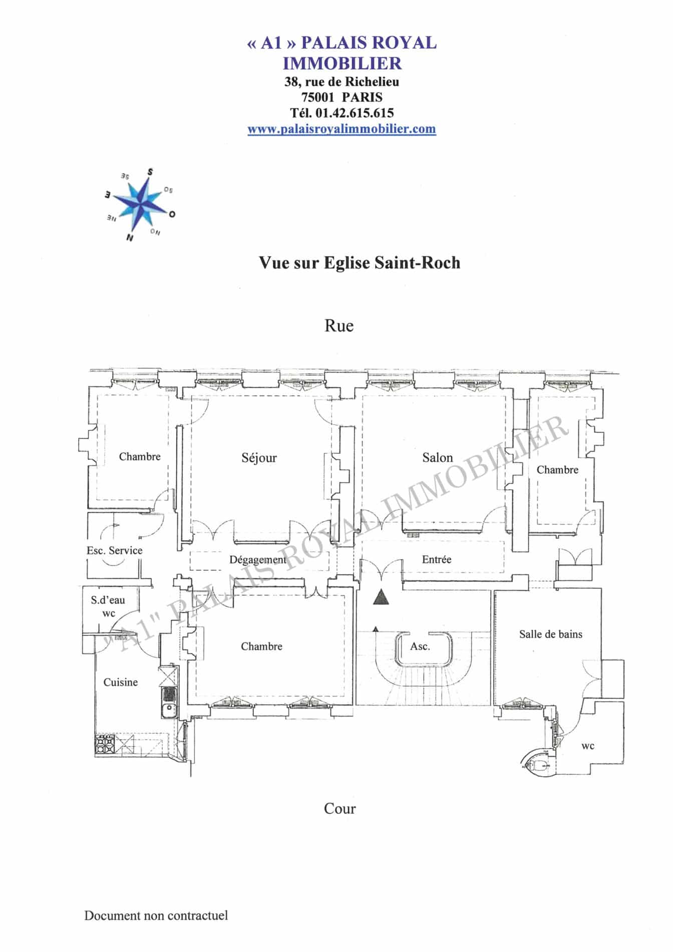 View of Saint-Roch Church – Dual-aspect apartment offering 2 large reception rooms + 3 bedrooms – Spacious rooms – Ceiling height: 3.70m throughout – Bright and sunny – Main exposure to the south-east.