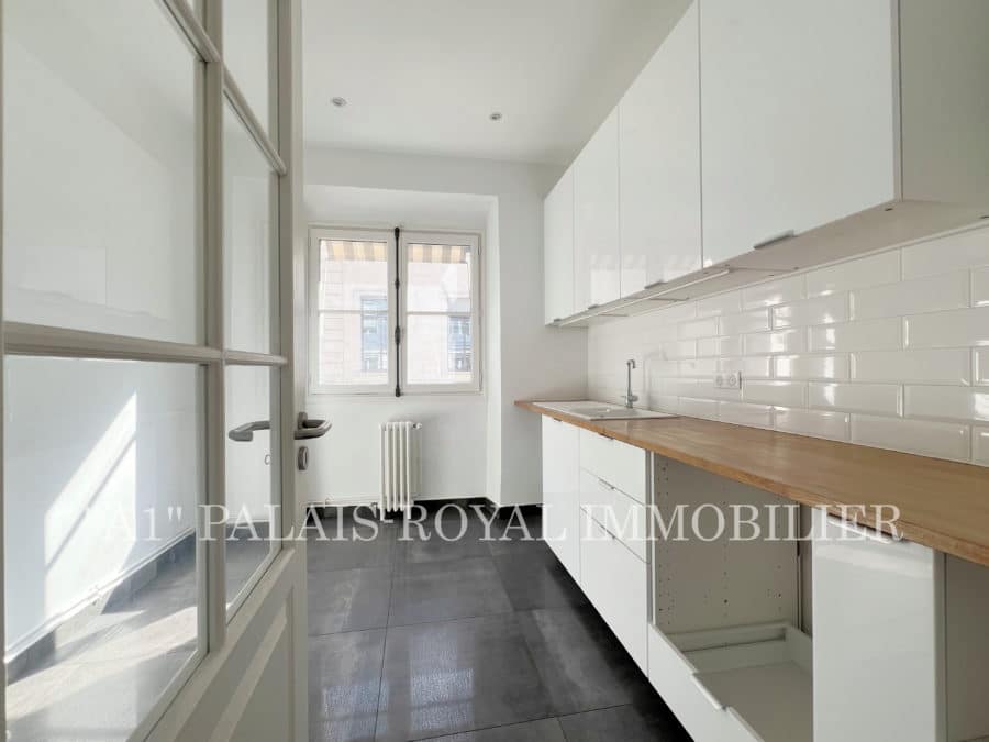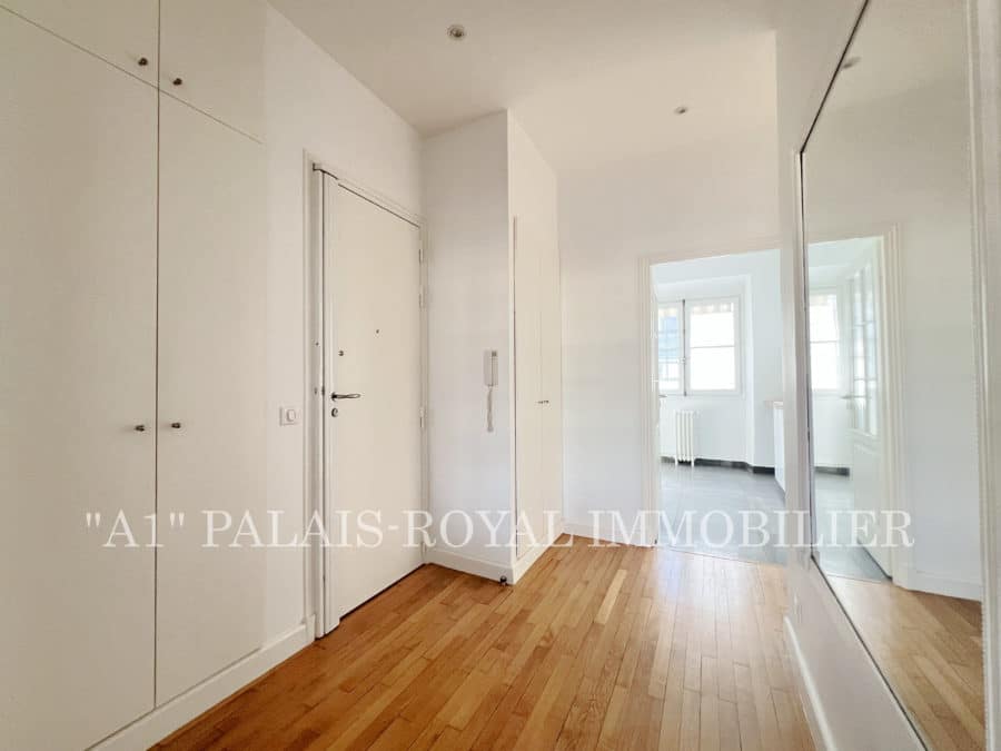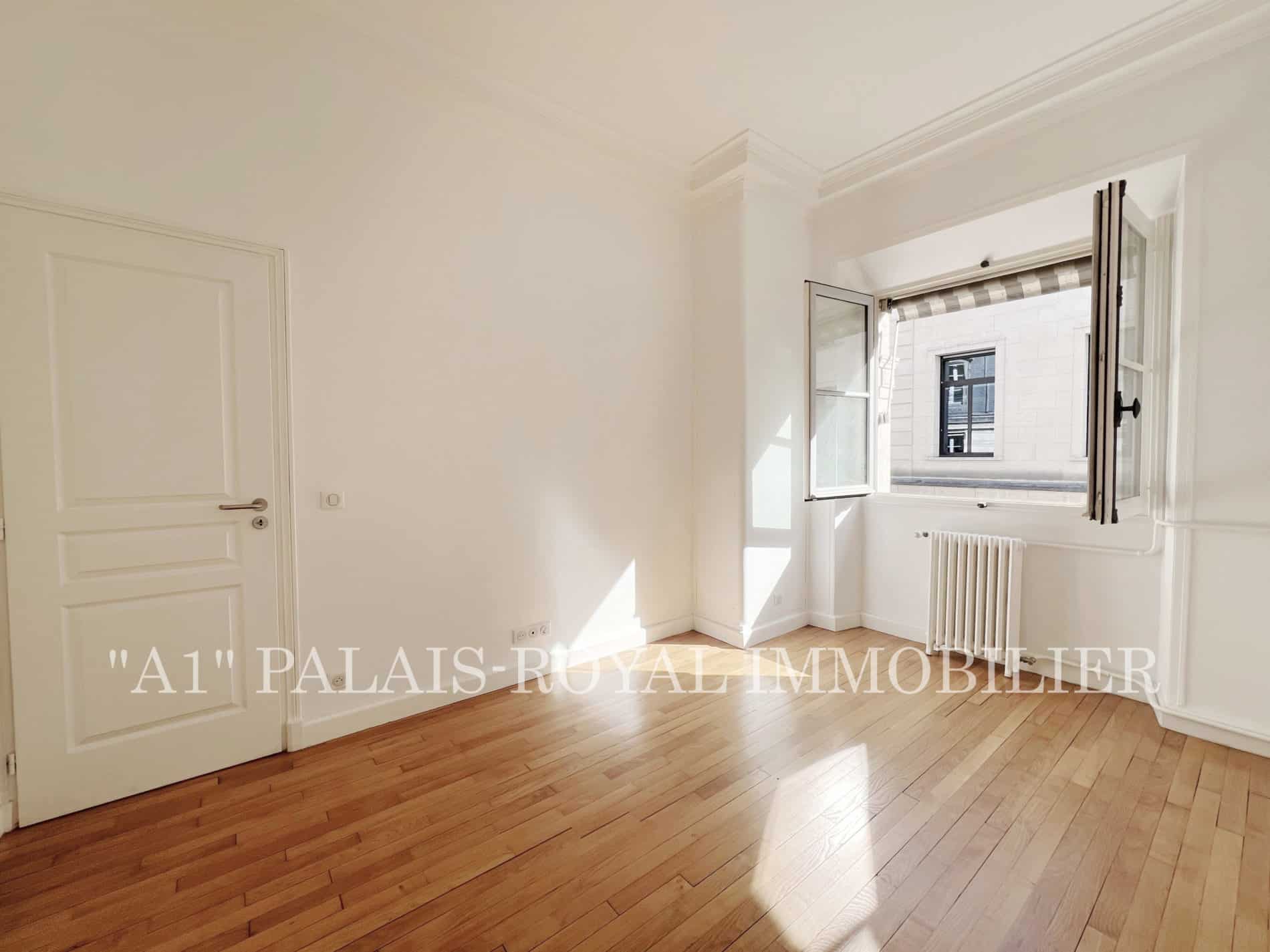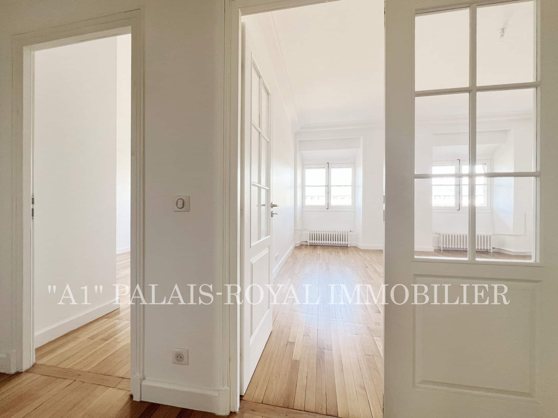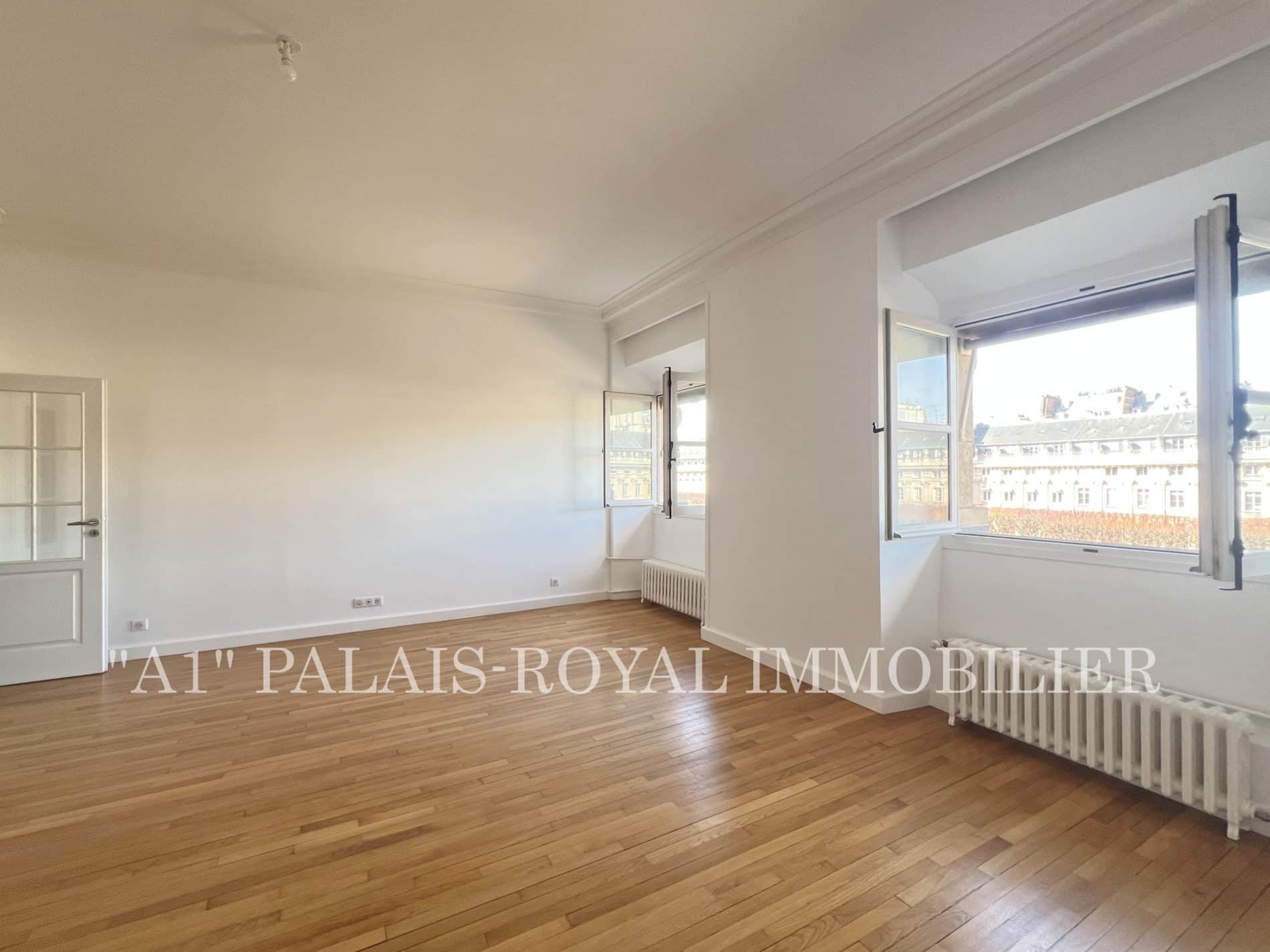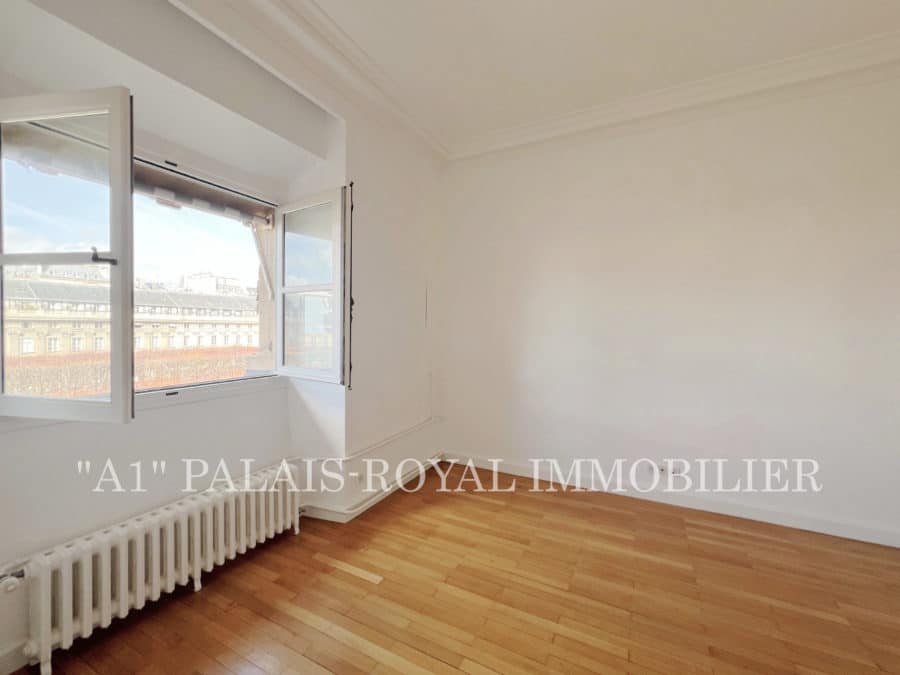 Double-aspect flat with 3 windows overlooking the Palais-Royal gardens – Quiet and sunny – East-west facing – Ceiling height: 2.80m.